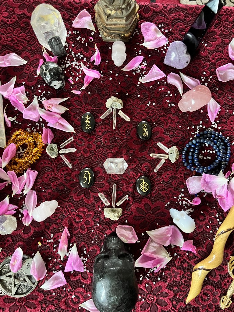 The outer body of both practices can seem different, as aesthetics range from love, light, angels and Buddhas with Reiki, and skulls, thorns, moons, and sometimes many Goddesses and Gods in Witchcraft. I’m being glib to make a casual point, open your social and hashtag Reiki and then Witchcraft, and see the difference. While the image of the two may seem to suggest entirely different worlds, there are a lot of practitioners that will tell you they can be used together to create a powerful healing experience.