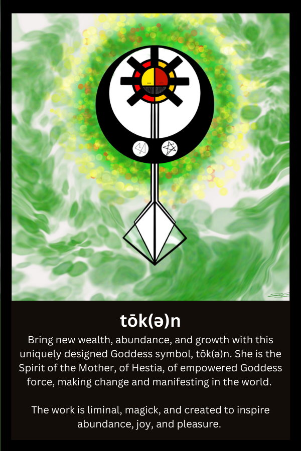 Designing tōk(ə)n was magick from beginning to end. I create a ritual, deep dived in vision, listened in my sacred space, and returned to translate that image into reality. I use it in my own magick and it is designed to empower through this unique third spirit energy of Goddess and God, as one being, seeding your potentials into the astral tides, to manifest your clear and empowered spells, rituals, and intent.