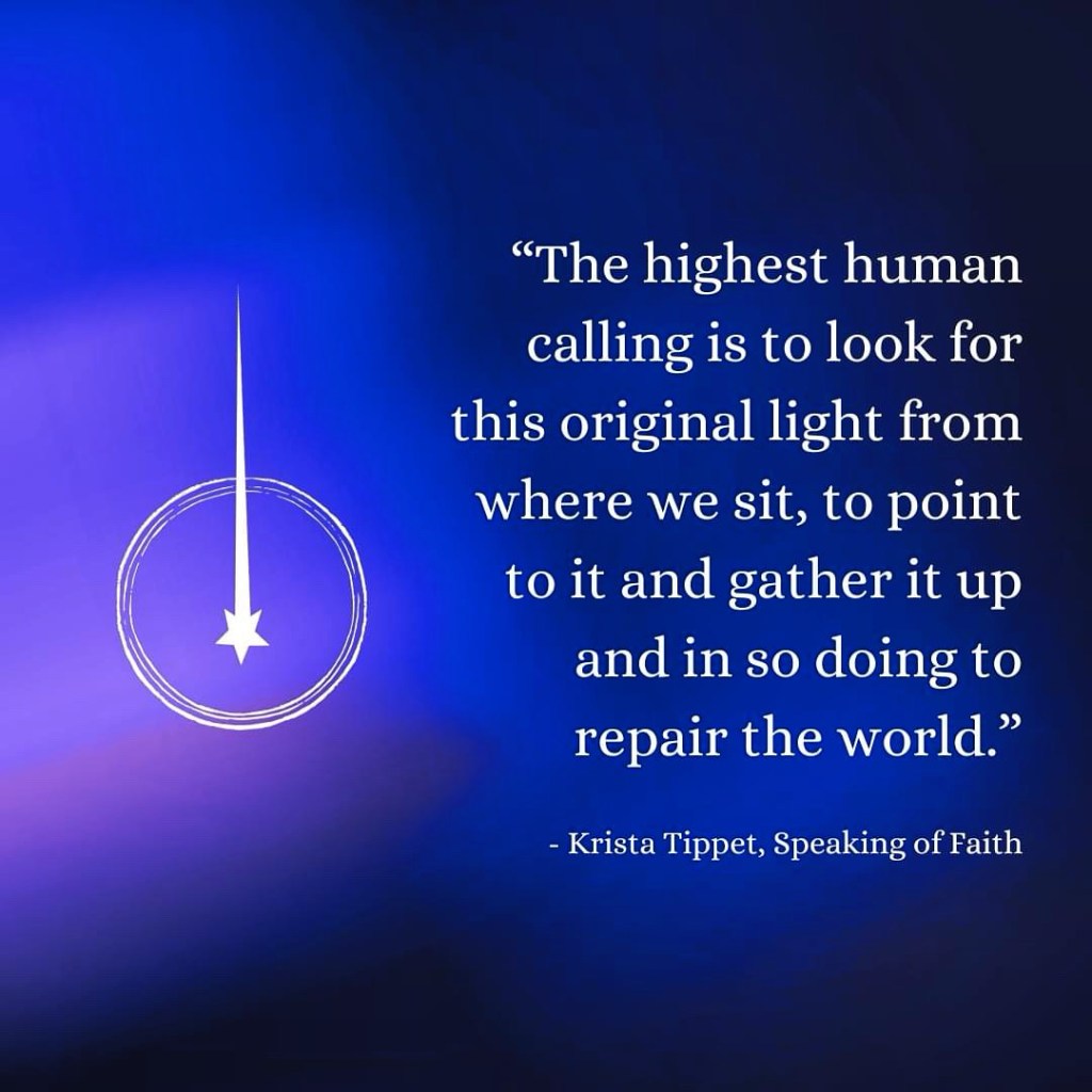 “Tikkun Olam. There is a Jewish legend behind this notion. Sometime early in the life of the world, something happened to shatter the light of the universe into countless pieces. They lodged as sparks inside every part of the creation. The highest human calling is to look for this original light from where we sit, to point to it and gather it up and in so doing to repair the world. This can sound like an idealistic and fanciful tale. But Dr. Rachel Naomi Remen, who told it to me as her Hasidic grandfather told it to her, calls it an important and empowering story for our time. It insists that each one of us, flawed and inadequate as we may feel, has exactly what’s needed to help repair the part of the world that we can see and touch.”