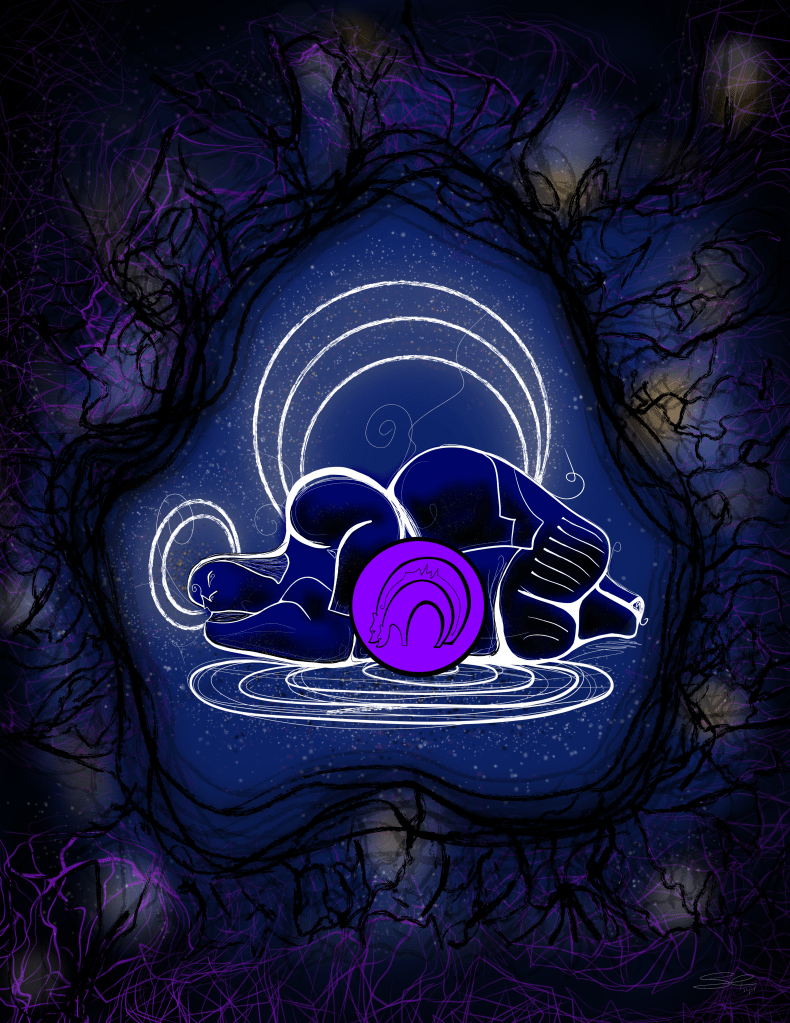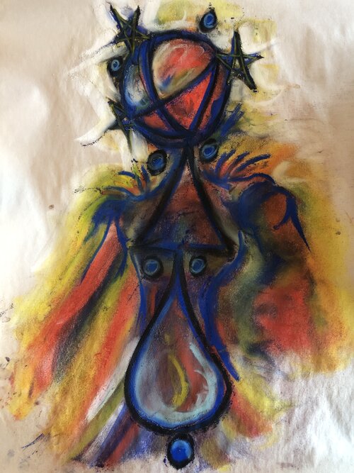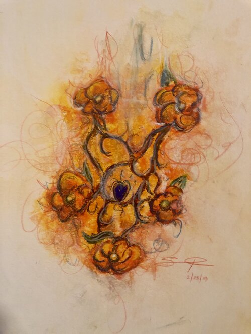 I use various mediums and I’m a mostly self-taught in chalk, pen and ink, mixed-media, and collage with various materials with influences from small local teachers and friends. I have crafted works for private buyers, spirit pieces for spiritual-magickal growth, and award winning designs for such organizations as the Southern California Red Cross Blood Services where one of my pieces remains on public display today; charity events such as the Best Friends Animal Network, Children of the Night; magazines such as the White Crane Journal, and various online mediums for healing, and other interests. Current projects include writing (below) and a an ongoing exploration on Patreon where much of the work becomes art for subscribers, or commissioned work.